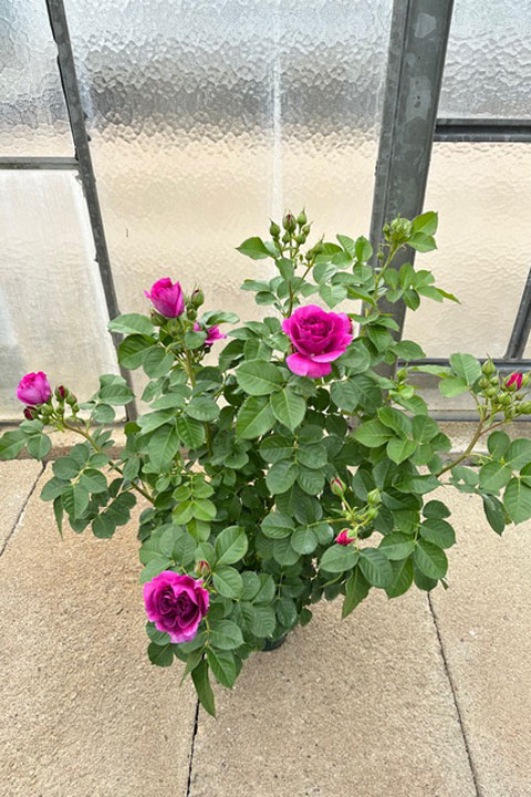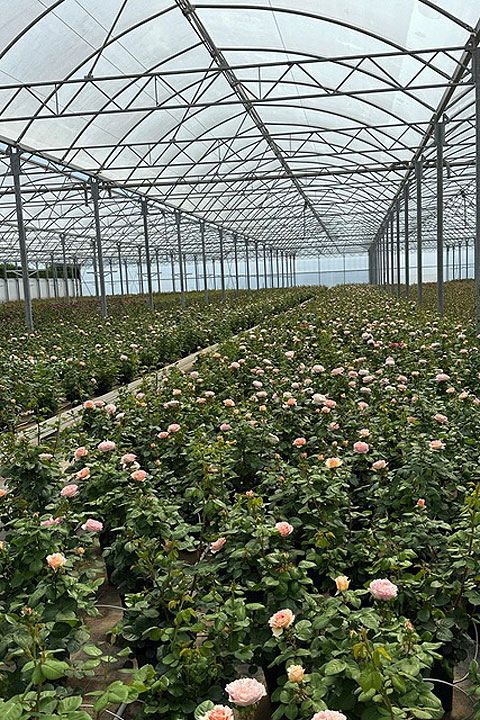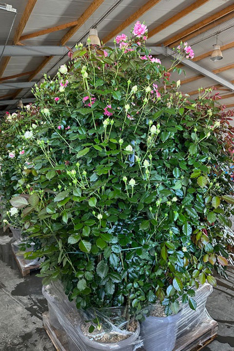 Les rosiers de bouture ou greffés sont conditionnés et stockés en pot de 2 à 25 L, sous serre, pour être vendus en toute saison et plantés toute l’année.